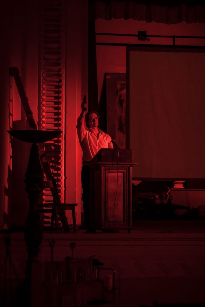 Laval on Jarmo Reha ise, Aare Pilv (mõlemad on ka lavastuse dramaturgid) ning Pääru Oja. Žanrilt on lavastus mikstuur – siia on kokku liidetud kõnekoosolek, salongiõhtu, loeng, installatsioonikunst ja rituaal. Tegu on Gesamtkunstwerk’iga, kus tekst, visuaalkunst, ruumikogemus ja kõlakunst on võrdsetel positsioonidel. Üheks partneriks kunstilise terviku teostumisel on mõistagi ka publik ise.